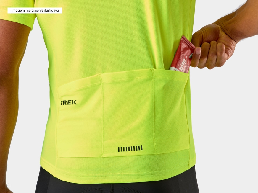 O material principal respirável e macio extrai a umidade para mantê-lo seco. Três bolsos abertos nas costas proporcionam acesso conveniente às suas necessidades ao pedalar. O design em estilo "drop tail" com faixa de aperto de silicone cobre as costas em posições ao pedalar para ajuste específico para o ciclismo. O zíper YKK em todo o comprimento com tira reciclada permite ventilação ideal em subidas longas ou dias quentes. Este produto recicla o equivalente a 29 garrafas PET de água. Proteção UV 50+. A modelagem semiajustada acompanha as curvas do seu corpo mantendo espaço livre para a movimentação.