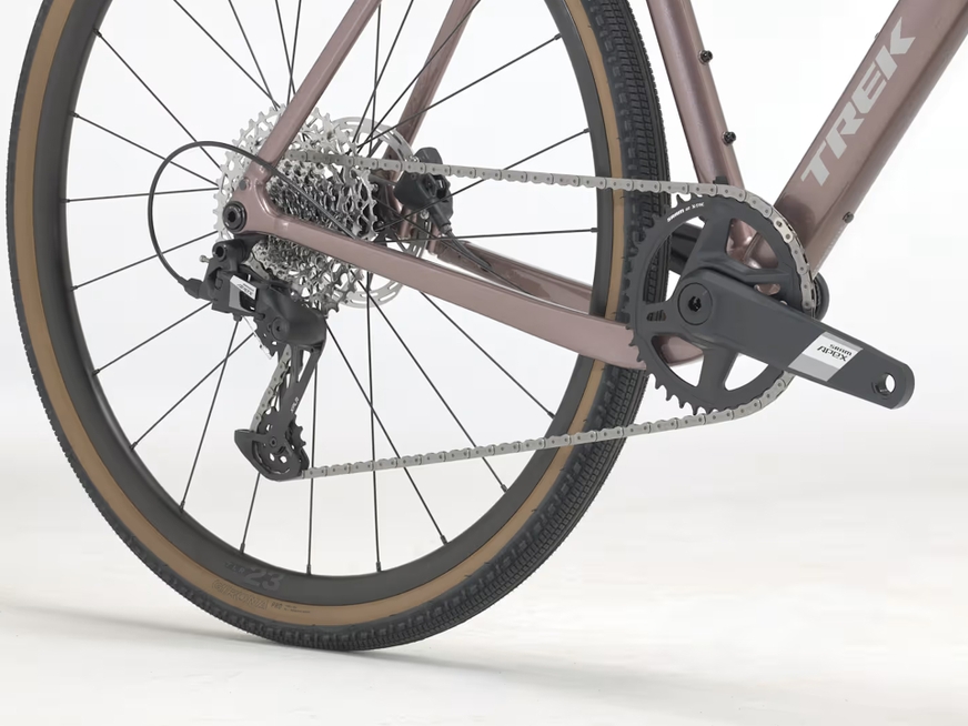 *Favor observar - as especificações se aplicam a todos os tamanhos, a menos que estejam listados separadamente Conjunto de quadro Quadro Alumínio Alpha série 300, roteamento de cabos interno, guia de corrente 3S, T47, gancheira universal (UDH), pontos de fixação para bagageiro e para-lamas, suportes integrados para bolsas de quadro, freio a disco de montagem plana, eixo direto chanfrado 142x12mm Garfo Trek Checkpoint, full carbon, tapered steerer, rack mounts, fender mounts, flat mount disc, 12x100mm thru axle Peso Peso MG – 9,87 kg/21,76 lbs (com selante TLR, sem câmaras) Limite de peso Esta bike tem um limite máximo de peso total (peso combinado da bicicleta, ciclista e carga) de 125 kg (275 libras). Transmissão Alavanca de câmbio SRAM Apex, 12 speed Desviador traseiro SRAM Apex XPLR, catraca máxima 44D *Pedivela Tamanho: P SRAM Apex 1, 40D, DUB Wide, comprimento 165mm Tamanho: MG, M SRAM Apex 1, 40D, DUB Wide, comprimento 170mm Tamanho: G SRAM Apex 1, 40D, DUB Wide, comprimento 172,5mm Movimento central SRAM DUB Wide, T47 roscado, rolamento interno Cassete SRAM XPLR PG-1231, 11-44, 12 velocidades Corrente SRAM Apex, 12 velocidades Tamanho máximo do elo de corrente 1x:44 2x: 46/30 Rodas Cubo dianteiro Liga Bontrager, rolamento selado, disco de bloqueio central, eixo direto 100 x12mm Blocagem dianteira Eixo direto chanfrado Switch Bontrager Cubo traseiro Bontrager em liga, rolamento selado, disco de bloqueio central, cubo livre de 11 velocidades Shimano e eixo direto 142x12mm Blocagem traseira Eixo direto chanfrado Switch Bontrager, alavanca removível Aro Bontrager Paradigm 23, Tubeless Ready, 24 furos, largura de 23mm, válvula Presta Raios Aço inoxidável 14g, Preto Pneu Bontrager Girona Pro, Tubeless Ready, proteção contra furos GR, talão de aramida, 60 tpi, 700x42mm Peça de pneu Injetor de selante para pneus sem câmara Bontrager, 6 onças Tamanho máximo do pneu 50mm sem para-lamas, 42mm com para-lamas (conforme medido, consulte o manual para mais detalhes) Componentes Selim Verse Short Comp, trilhos de aço, largura 145mm Canote Liga Bontrager, 27,2 mm, deslocamento 12 mm, comprimento 330 mm *Guidão Tamanho: P Bontrager Elite Gravel, liga, largura 40cm Tamanho: MG, M Bontrager Elite Gravel, liga, largura 42cm Tamanho: G Bontrager Elite Gravel, liga, largura 44cm Fitas para guidões Fita de guidão Supertack Bontrager *Avanço Tamanho: P, M Bontrager Elite, 31,8 mm, compatível com Blendr, 7 graus, comprimento de 80mm Tamanho: MG, G Bontrager Elite, 31,8mm, compatível com Blendr, 7 graus, comprimento 90mm Freio SRAM Apex D1 hydraulic disc, flat mount Rotor de freio SRAM Paceline, arredondado, Centerlock, 160mm Manete de freio SRAM Apex, 12 speed Tamanho do rotor Tamanhos máximos dos rotores de freios: 180mm dianteiro e traseiro