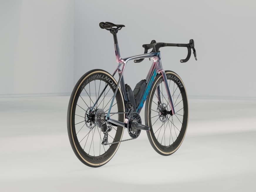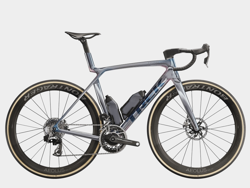 Um quadro de impressionante leveza construído com OCLV Carbon Série 900, nosso carbono de mais alto nível, com tubos aerodinâmicos, tecnologia de conforto IsoFlow, e Caramanholas e Suportes RSL Aero, que otimizam a performance economizando watts. A mais recente transmissão da SRAM, a ultraleve RED AXS E1, com o medidor de potência para treinar com dados. Uma gancheira de desviador universal que possibilita encontrar peças de reposição em qualquer lugar. Além disso, conta com rodas de carbono tubeless Bontrager Aeolus RSL 51 e um guidão/avanço Trek Aero RSL em uma única peça.