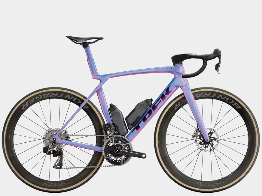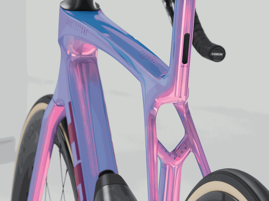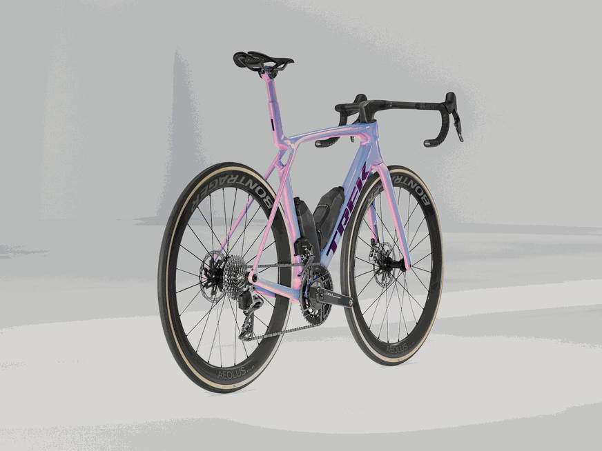 Um quadro de impressionante leveza construído com OCLV Carbon Série 900, nosso carbono de mais alto nível, com tubos aerodinâmicos, tecnologia de conforto IsoFlow, e Caramanholas e Suportes RSL Aero, que otimizam a performance economizando watts. A mais recente transmissão da SRAM, a ultraleve RED AXS E1, com o medidor de potência para treinar com dados. Uma gancheira de desviador universal que possibilita encontrar peças de reposição em qualquer lugar. Além disso, conta com rodas de carbono tubeless Bontrager Aeolus RSL 51 e um guidão/avanço Trek Aero RSL em uma única peça.
