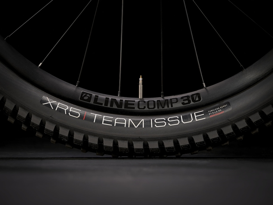 Roda dianteira Bontrager Line Comp 30, Tubeless Ready, 6 parafusos, Boost110, eixo direto 15mm, 29 pol Roda traseira Bontrager Line Comp 30, Aro Tubeless Ready em alumínio High Strength Série 6000, Rapid Drive 108, 6 parafusos, cubo de roda livre Shimano MicroSpline, Boost148, eixo direto 12mm, 29 pol Blocagem traseira Eixo direto Switch Bontrager, alavanca removível Pneu Bontrager XR5 Team Issue, aro pronto para tubeless, Inner Strength Casing, talão de aramida, 60 fios, 29 x 2,50" Peça de pneu Injetor de selante para pneus sem câmara Bontrager, 6 onças Fita de aro Bontrager TLR Tamanho máximo do pneu Quadro: 29 x 2.60 pol., Garfo: Veja o fabricante