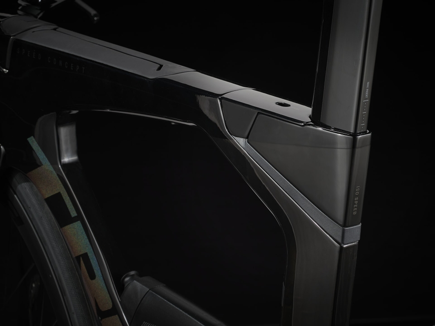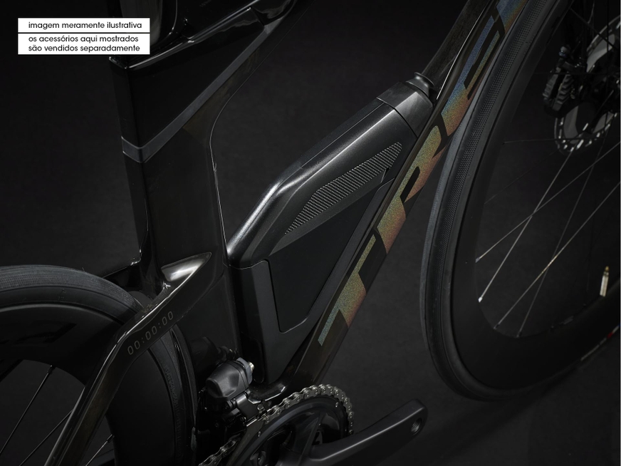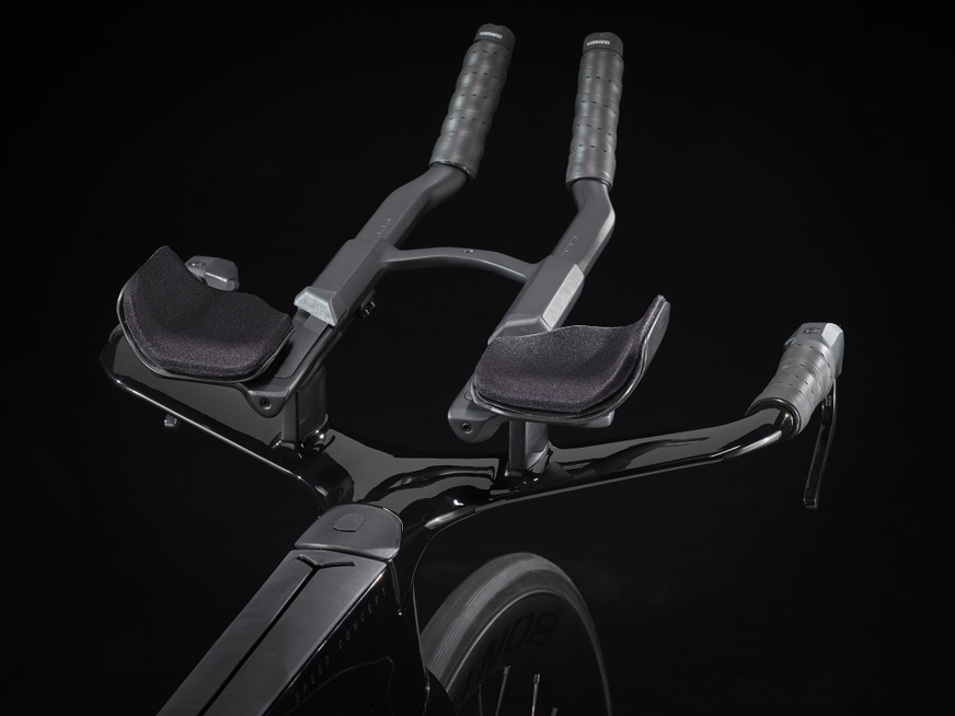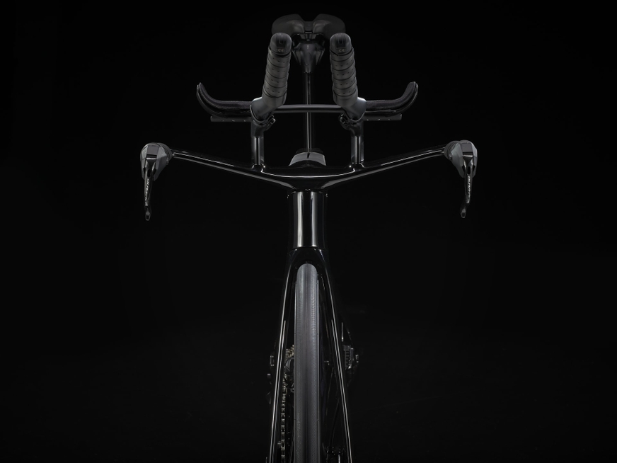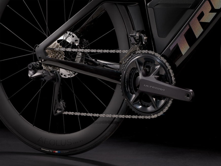 O quadro em carbono OCLV Série 800 ultraleve, o formato de tubo Kammtail Virtual Foil (KVF) que reduz o arrasto aerodinâmico, o garfo tipo aerofólio totalmente em carbono Speed Concept, amortecedor IsoSpeed que suaviza a estrada, armazenamento integrado para alimentos, hidratação e kits de reparo de pneus, transmissão eletrônica sem fio Shimano Ultrega Di2 de 12 velocidades, guidão e avanço totalmente integrados, selim específico para triathlon Bontrager Hilo Comp para uma postura agressiva e aerodinâmica, freios a disco para um poder de frenagem confiável e rodas aerodinâmicas Bontrager Aeolus Pro 51 de OCLV Carbon.