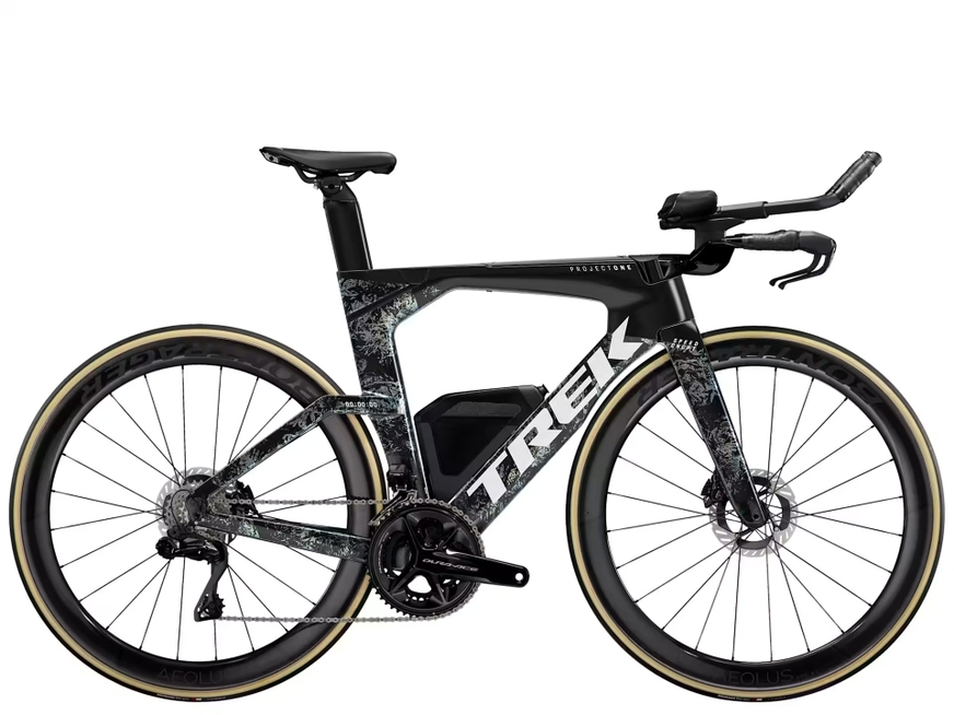 O quadro em carbono OCLV Série 800 ultraleve, o formato de tubo redutor de arrasto Kammtail Virtual Foil (KVF), o garfo tipo aerofólio totalmente em carbono Speed Concept, IsoSpeed amortecedor de vibrações da estrada, bolsas para armazenamento integradas e aerodinâmicas para kits para reparos de pneus, hidratação e barras energéticas, transmissão eletrônica sem fio Shimano Dura-Ace de 12 velocidades, guidão e avanço totalmente integrados, selim específico para triathlon Hilo Pro Carbon Bontrager para uma postura agressiva e aerodinâmica, freios a disco para poder de frenagem confiável e rodas aerodinâmicas Aeolus RSL 51 Bontrager.